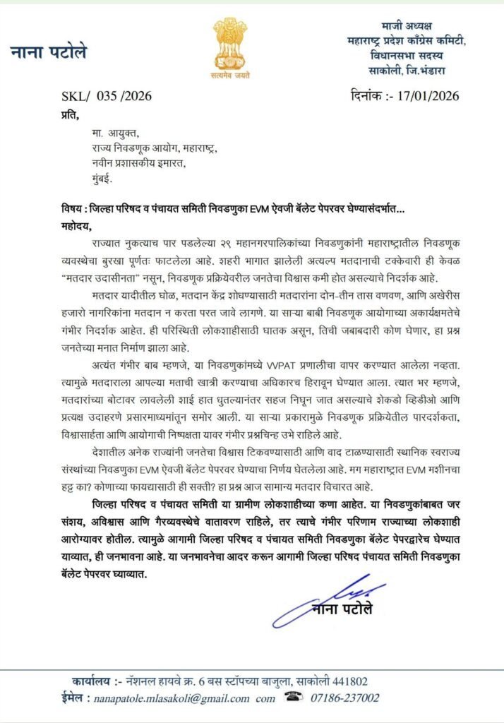 मुंबई :महाराष्ट्र में जिला परिषद और पंचायत समिति चुनावों को लेकर राजनीतिक माहौल गरमा गया है। कांग्रेस के पूर्व प्रदेश अध्यक्ष और विधायक नाना पटोले ने इन चुनावों को EVM के बजाय बैलेट पेपर से कराने की जोरदार मांग की है। इस संबंध में उन्होंने राज्य के मुख्य चुनाव आयुक्त और मुख्यमंत्री देवेंद्र फडणवीस को पत्र लिखकर हाल ही में संपन्न महानगरपालिका चुनावों पर गंभीर सवाल खड़े किए हैं।